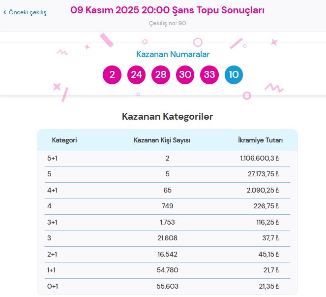 Şans Topu sonuçları 9 Kasım 2025 Pazar: 2, 24, 28, 30, 33 + 10 (Şans Topu)