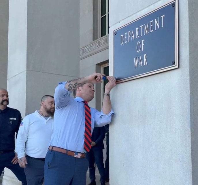 Bakanlığın sosyal medya hesaplarında paylaşılan videoda, Savunma Bakanı Pete Hegseth’in yeni levhayı kendi elleriyle vidaladığı görüldü. Hegseth, bu hamlenin sembolik önemine dikkat çekerek: